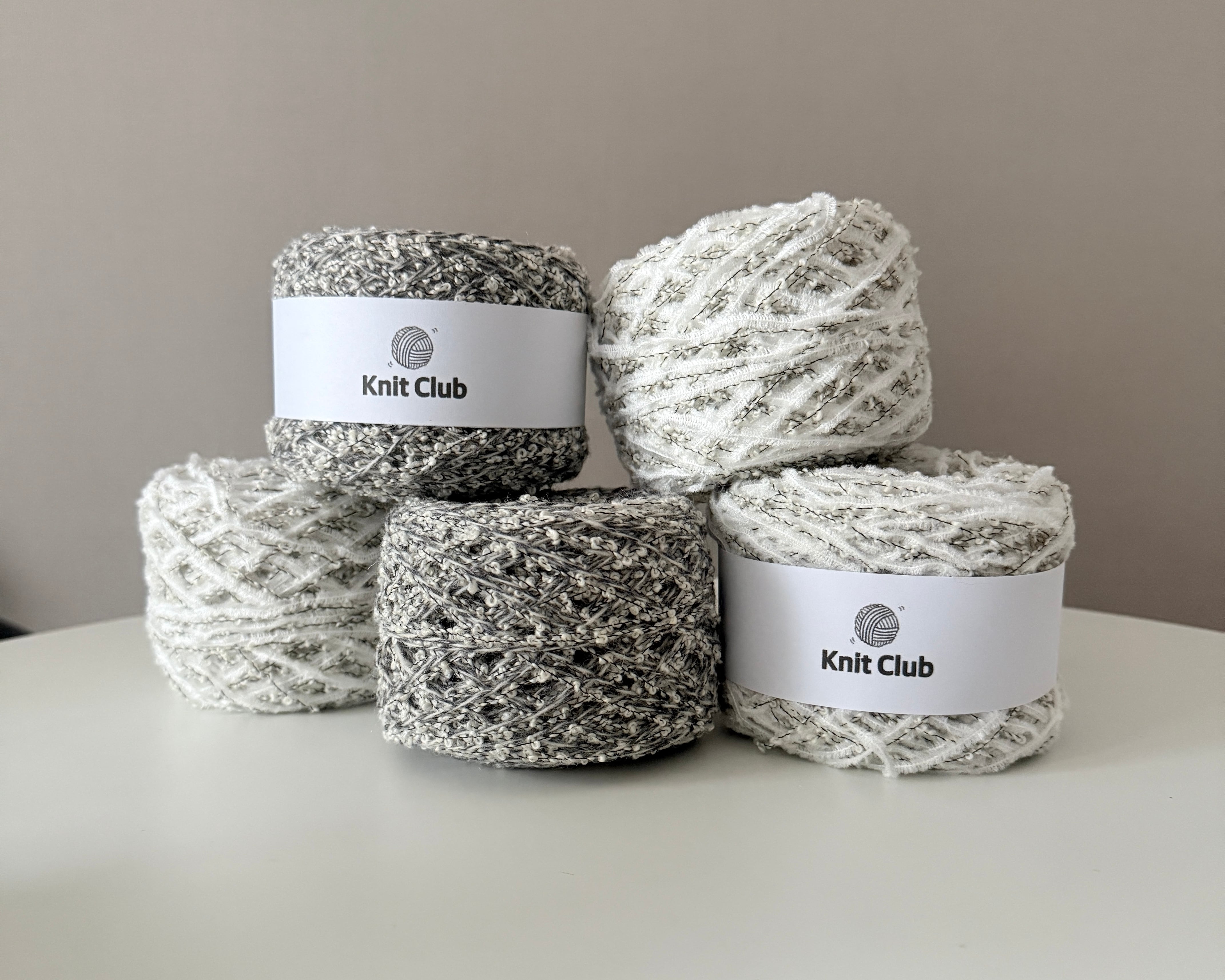 ファンシーヤーンを組み合わせたモノトーンの引き揃え糸です。